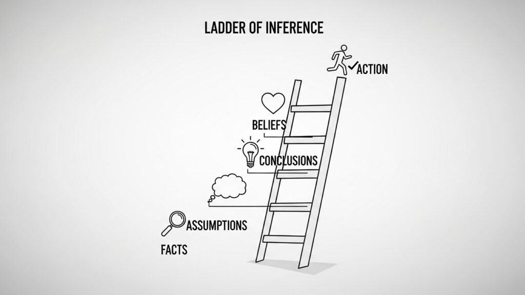 The Ladder of Inference, developed by Chris Argyris, is a tool that helps individuals understand how they arrive at conclusions. This exercise encourages you to reflect on the steps you take—from observing facts to making assumptions—so you can evaluate whether your reasoning is sound.